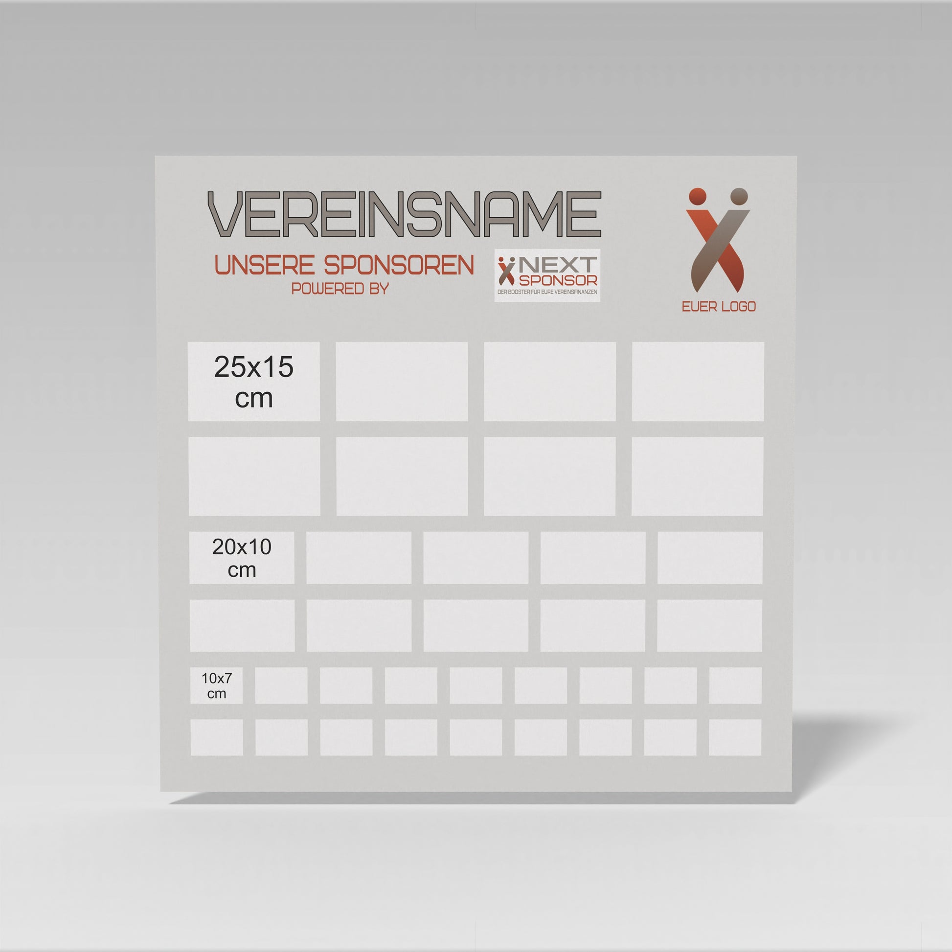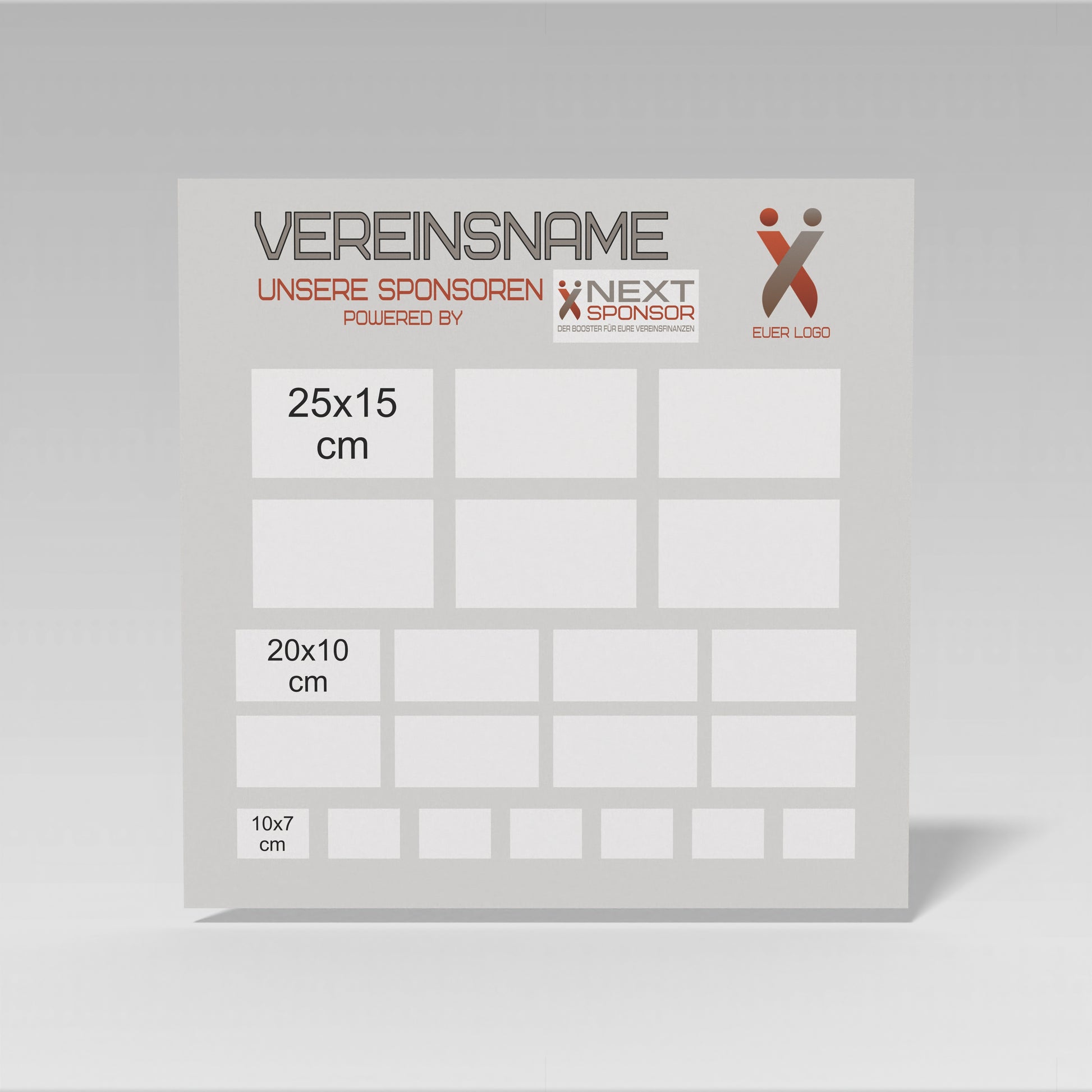 Mit unserer Sponsorentafel aus hochwertigem Aluminiumverbund präsentiert Ihr Sponsoren professionell und wirkungsvoll – direkt bei euch vor Ort. In verschiedenen Größen erhältlich, wetterfest und langlebig – ideal für Vereinsräume, Eingangsbereiche oder Veranstaltungen. Ein echter Blickfang, der Wertschätzung zeigt und Gemeinschaft stärkt.